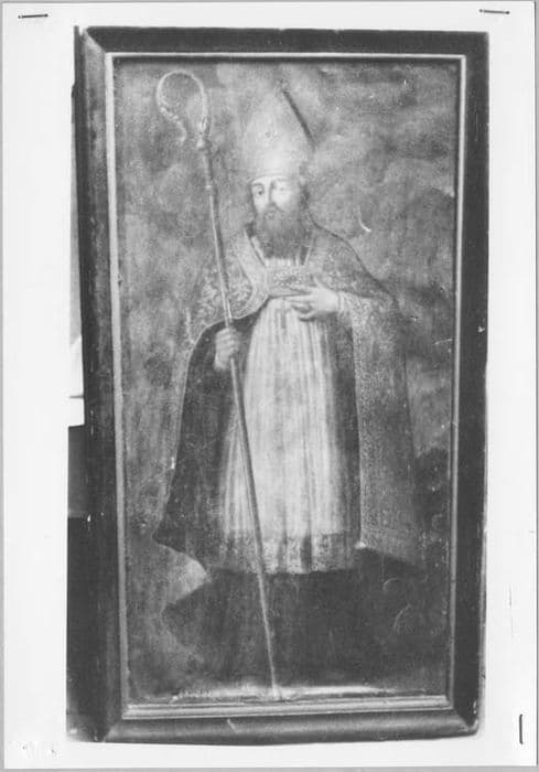 Portrait de saint Aignan en pied, en habit d'évêque, tient la crosse de la main droite.