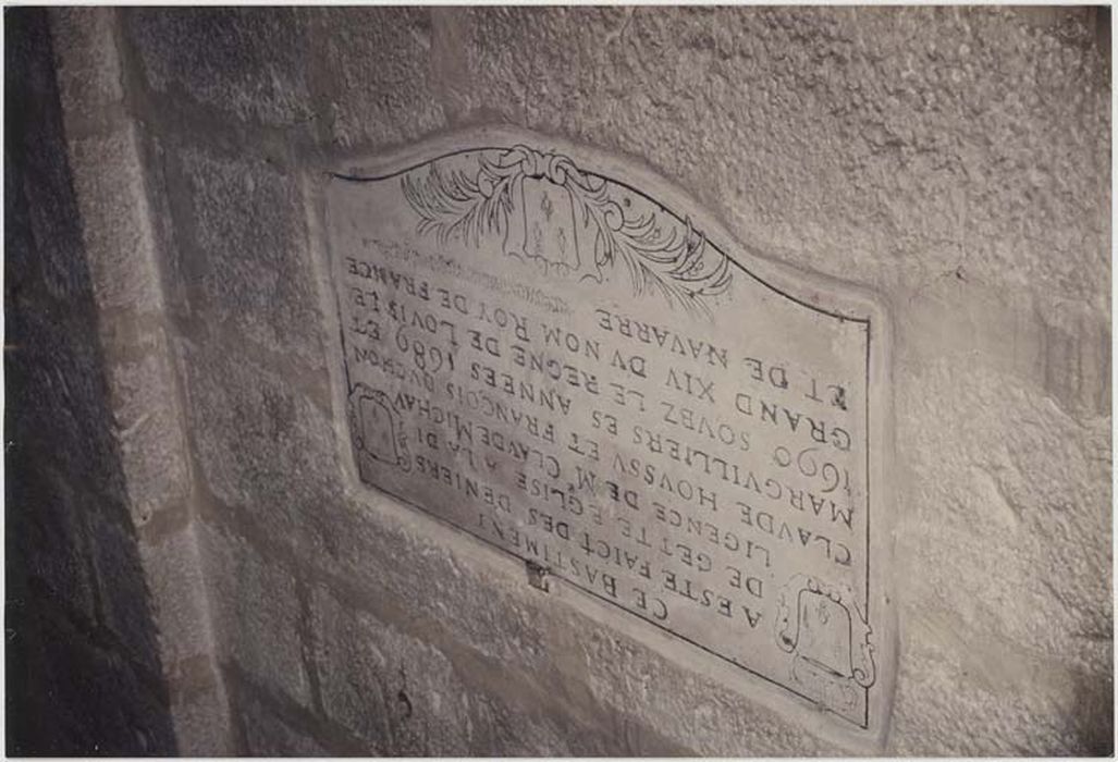 Inscription gravée : CE BASTIMENT / A ESTE FAICT DES DENIERS / LICENCE DE ME CLAVDE MICHAV / CLAVDE HOVSSV ET FRANCOIS DVCHON / MARGVILLIERS ES ANNEES 1689 ET / 1690 SOVBS LE REGNE DE LOVIS LE / GRAND XIV DV NOM ROY DE FRANCE / ET DE NAVARRE.