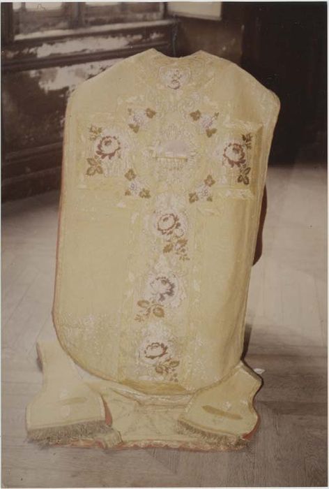 Drap d'or brodé. Croix décorée de roses sur la chasuble. Au centre : agneau pascal avec croix et les grappes de raisin, sur le livre aux sept sceaux. Le voile de calice est décoré d'une croix de Malte.