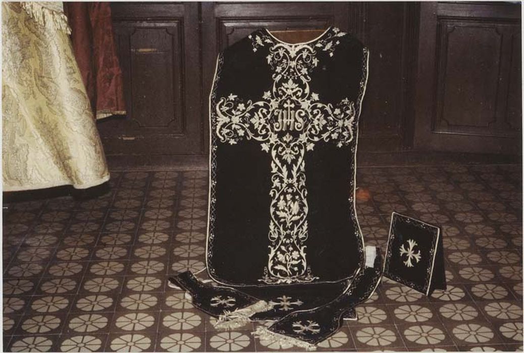 Ensemble de velours noir brodé de fil d'argent. Décor de volutes et de fleurs.
