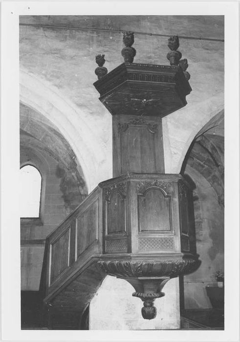 Abat-son avec colombes dans nuage et soleil (tête cassée) ; 4 pots à feu. 4 panneaux extérieurs sculptés et rinceaux. pieds sculptés, panneau arrière mouluré. Baquet sculpté de rinceaux, 5 coquilles. Même style et même époque que l'ensemble des boiseries. le plafond de l'abat-son s'effondre.