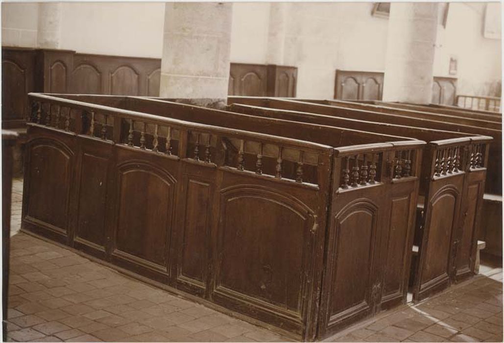 Ensemble de 28 bancs dans la nef : 15 bancs à droite ; 13 bancs à gauche ; 4 bancs ont une porte pleine sans motifs. 13 bancs semblables dans la partie gauche et un banc central.