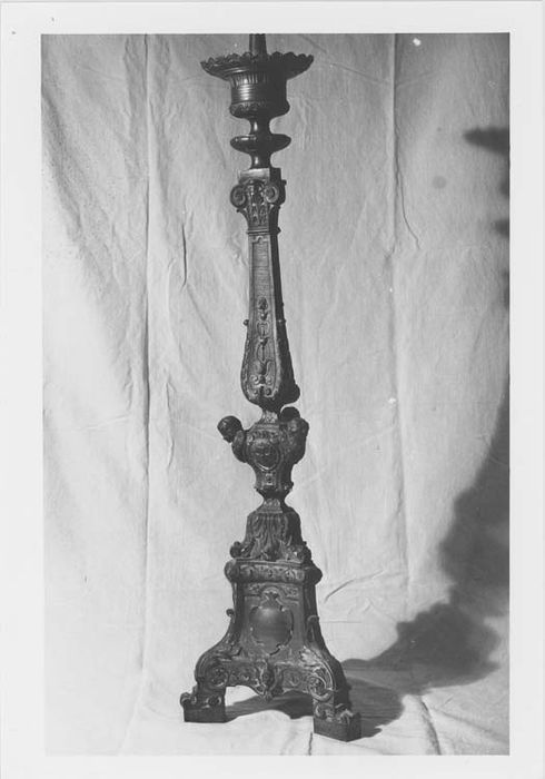 3 pieds ornés de guirlandes, noeud avec 3 têtes d'anges. Sur chaque face du triangle : tête de Vierge, tête de Christ, Inscription.