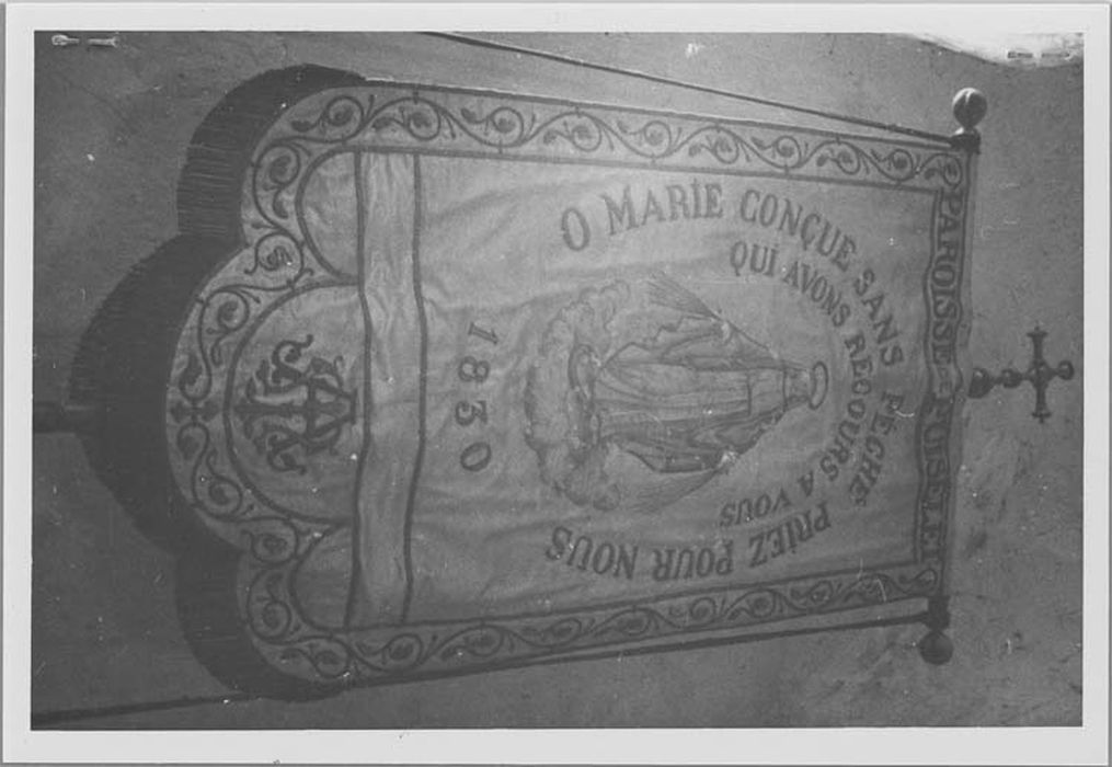 Inscription brodée et datée : PAROISSE DE PUISELET / O MARIE CONCU SANS PECHE PRIEZ POUR NOUS / QUI AVONS RECOURS A VOUS / 1830 / AM. Au revers : M en motif central.