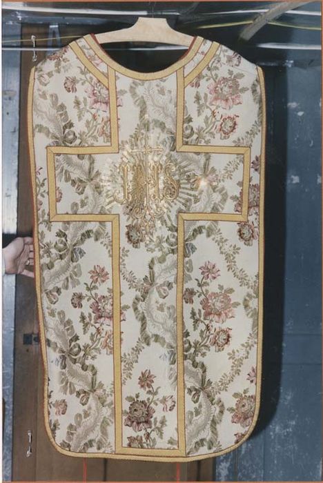 Chasuble en soie brodée beige, tissu Louis XVI, galon et broderie centrale fin XIXe siècle. Motif IHS et rayons dorés bandes : grecque/fils dorés fleurs rose, feuillage vert et gris.