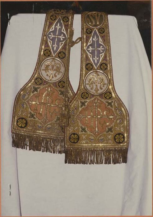 Etole en drap doré. Etole, cordelière et gland. le long de l'étole : lettres entrelacées : SV - SE - SF - AM ; semis de broderies à dessins géométriques aux extrémités : IHS.