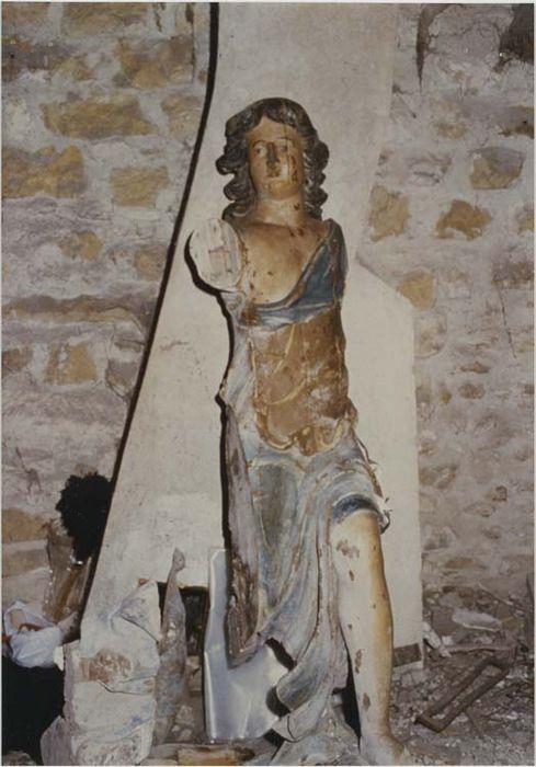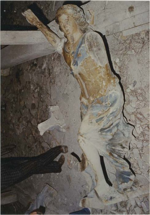 Fragments du retable du maître-autel. Il manque des bars, des jambes, un nez ; fente ; polychromie très abîmée.