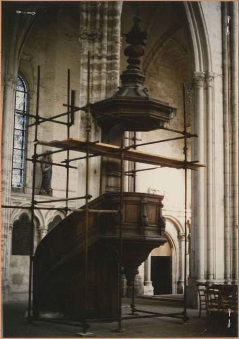 Chaire octogonale ; entre chaque panneau de la cuve figure un motif sculpté en forme de console avec volute. l'abat son orné de palme, surmonté d'un haut pignon décoré de motif floral ; sous l'abat-son, aigle aux ailes déployées sculpté.