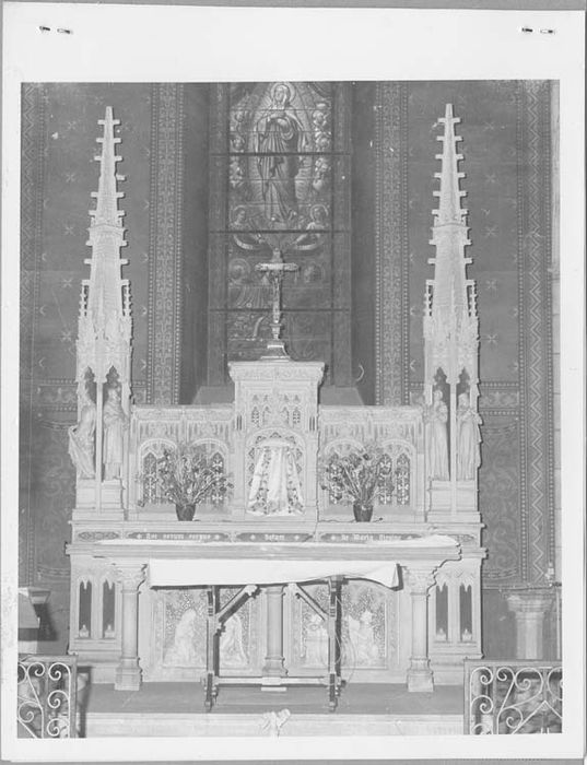 maître-autel ; panneaux sculptés : Annonciation, David jouant de la Harpe ; statues (4) : Sainte Thérèse, Saint Vincent de Paul, Saint François d'Assise, Sainte Geneviève