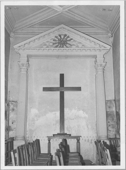 Inscription en haut du retable IHS ; petit retable très décoré qui disparait derrière un décor de courbes, volutes, fleurs, rubans, et guirlandes ; haut du retable : guirlande décorative dorée entourant l'inscription.