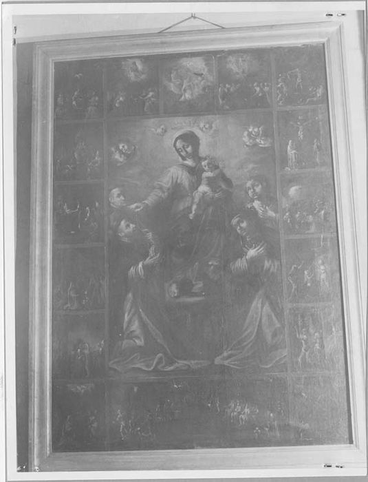 Vierge au rosaire : scène centrale encadrée par 17 petites scènes sur la vie de la Vierge.