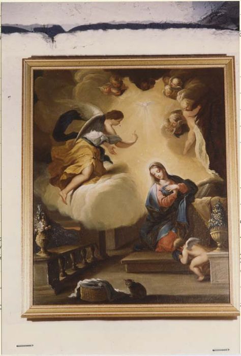 Tableau daté vers 1725. Toile de confrérie qui groupe quatre copies de tableaux célèbres du XVIIe siècle. Le panier et le chat sont inspirés de l'Enfant Jésus au sommeil de Charles Le Brun et les anges sont ceux de L'Annonciation d'Antoine Coypel.