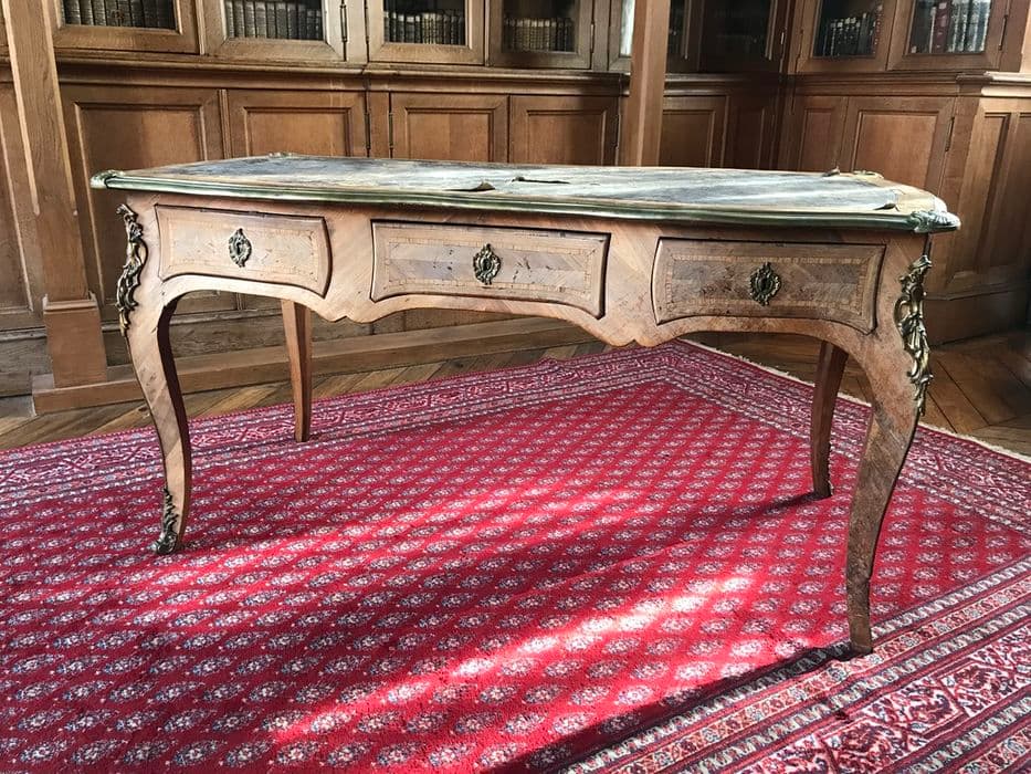 bureau de style Régence en marqueterie, garniture de cuivre et de bronze et cuir noir