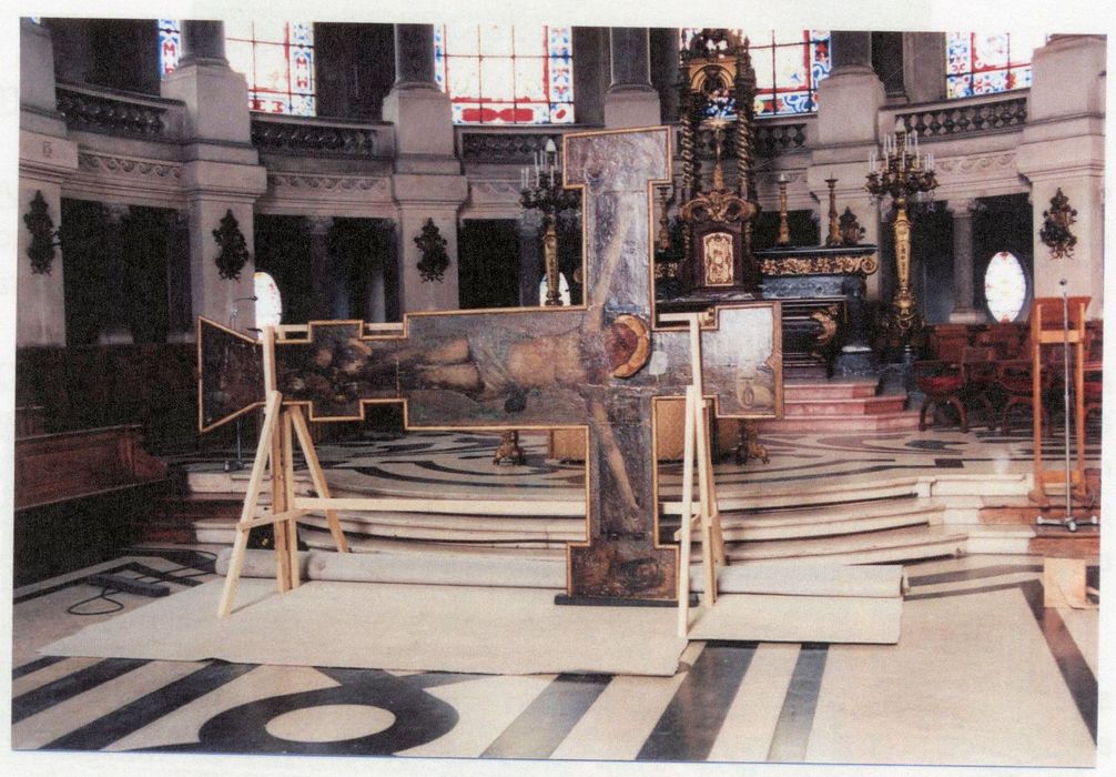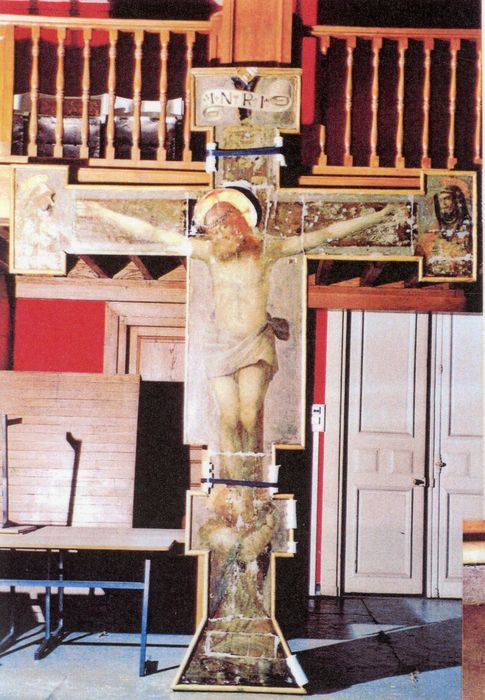 Tableau en forme de croix. Le Crucifix 'offre la curieuse combinaison d'une oeuvre monumentale en forme de croix latine et d'une composition peinte il y a moins de deux siècles. Lors de sa restauration entreprise en 1999, devant le constat de soulèvements et de l'état lacunaire de la couche picturale, cette association anachronique fut à l'origine de la recherche d'une composition plus ancienne par différentes investigations. L'étude du crucifix révéla trois états successifs : un premier état original associant support et couche peinte, puis deux repeints successifs datant vraisemblablement des XVIIe et XIXe siècles.' (Technè)