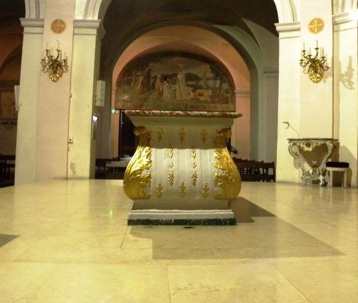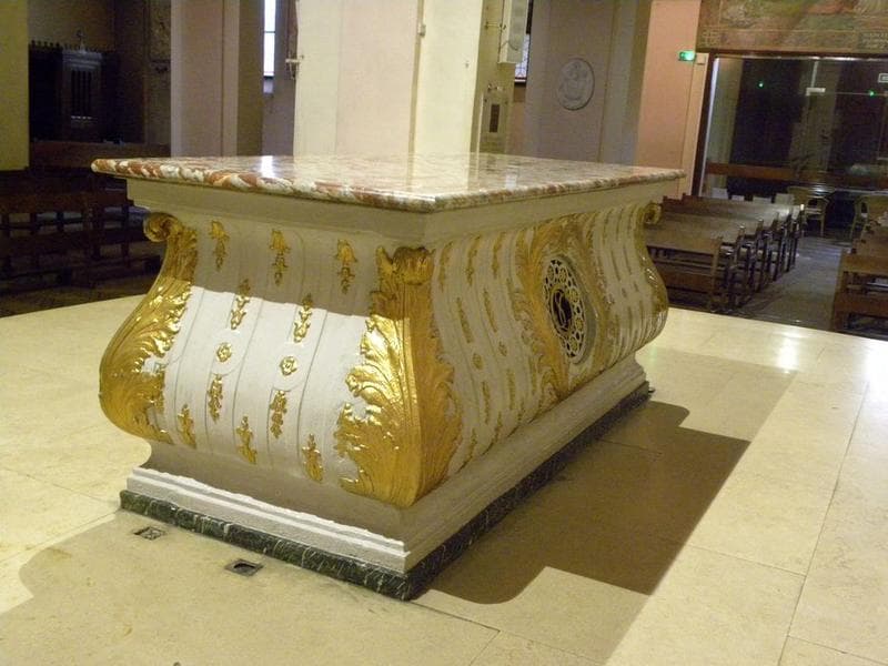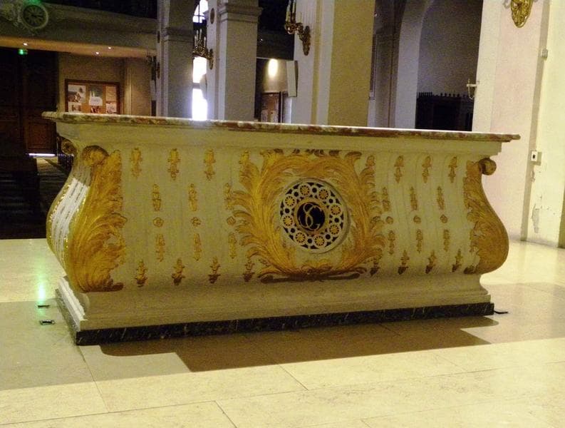Autel à la romaine en forme de sarcophage galbé, en pierre peinte en blanc et dorée, et dessus en brèche rouge. Les angles sont soulignés de palmes dorées. Au centre, devant et derrière, de grandes palmes encadrent une niche grillagée qui contenait autrefois les reliques. Les quatre faces de l'autel sont ornées d'un semis de branchages et de rosaces dorés.