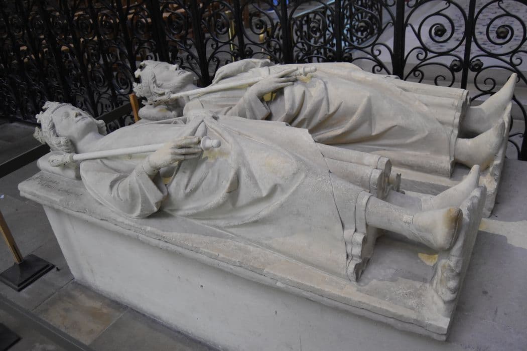 Statue funéraire. dalle funéraire à effigie en relief. Pierre de liais autrefois polychrome.