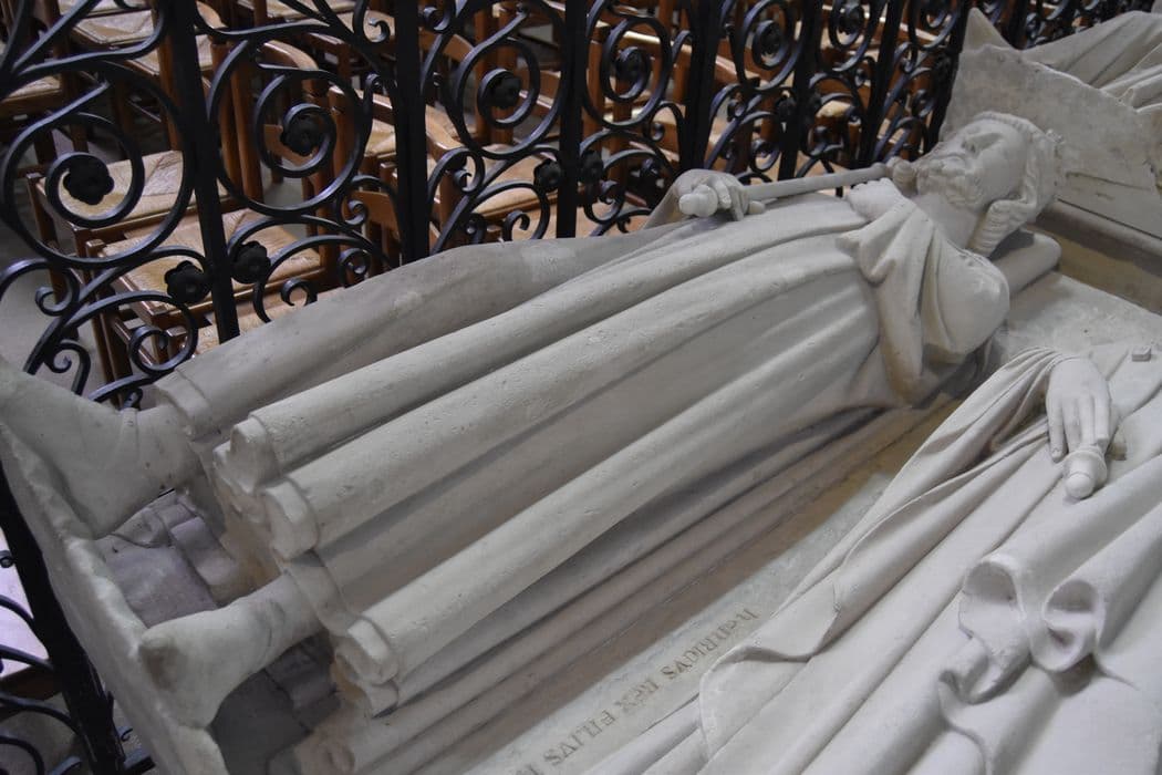 Statue funéraire. dalle funéraire à effigie en relief. Pierre de liais autrefois polychrome.