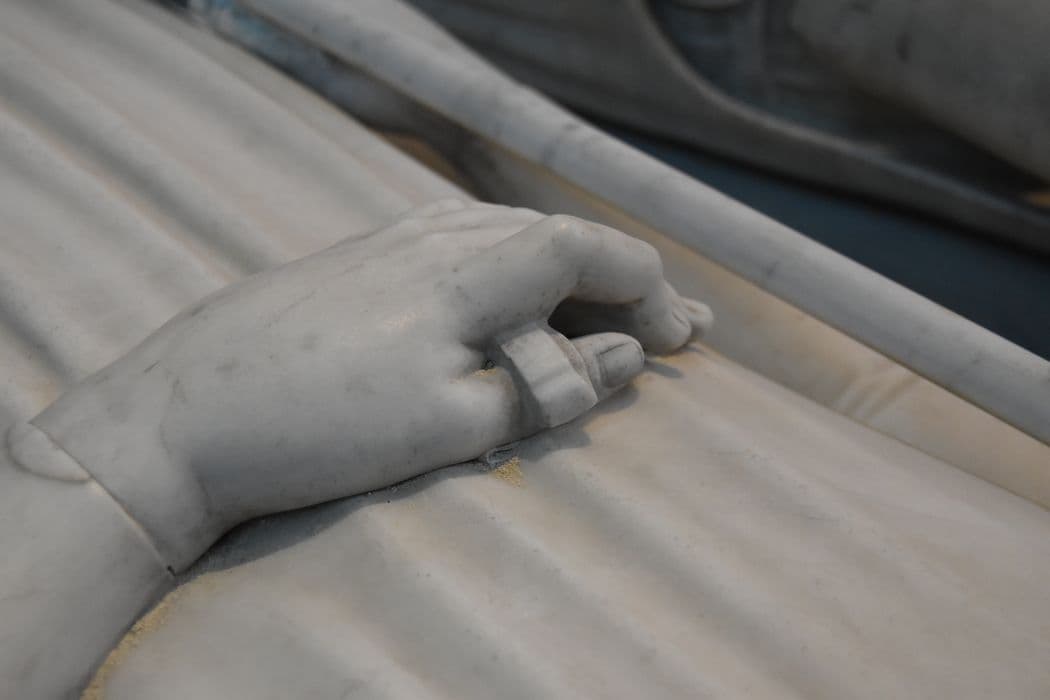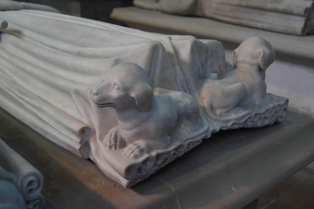 Statue funéraire. Dalle funéraire à effigie en relief. Au soubassement, sous des arcatures, se voyaient vingt-quatre statuettes de marbre représentant des ancêtres des deux défunts.