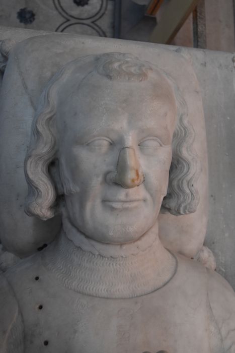 Statue funéraire. Dalle funéraire à effigie en relief. Emplacement incertain : bas-côté Nord ou choeur, sur le pourtour ?.