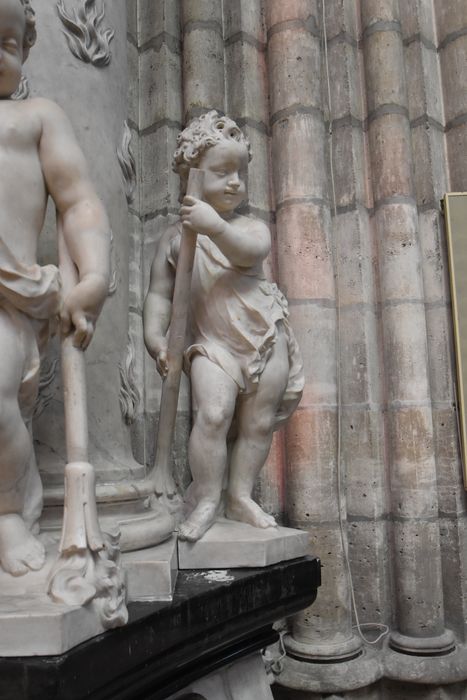 Œuvre exécutée entre 1562 et 1570. Le fils aîné d'Henri II et de Catherine de Médicis mourut à seize ans à Orléans, ville où le monument destiné à son coeur devait être érigé. En 1562, il fut décidé de le placer aux Célestins de Paris. Le chapiteau du sommet portait un vase de bronze contenant le coeur et un enfant tenant la couronne royale. Le projet primitif de cette sépulture, conçu par Le Primatice, fut amoindri. On utilisa trois des génies funéraires exécutés pour le tombeau de François Ier par Jacquio Ponce. C'est Jean Leroux qui est l'auteur de la décoration du piédestal.