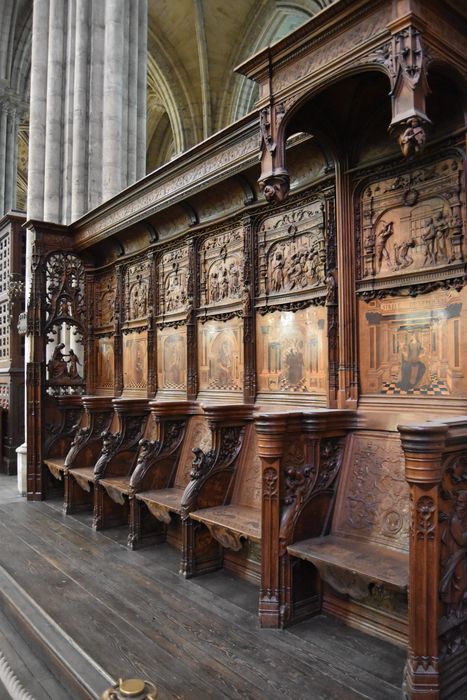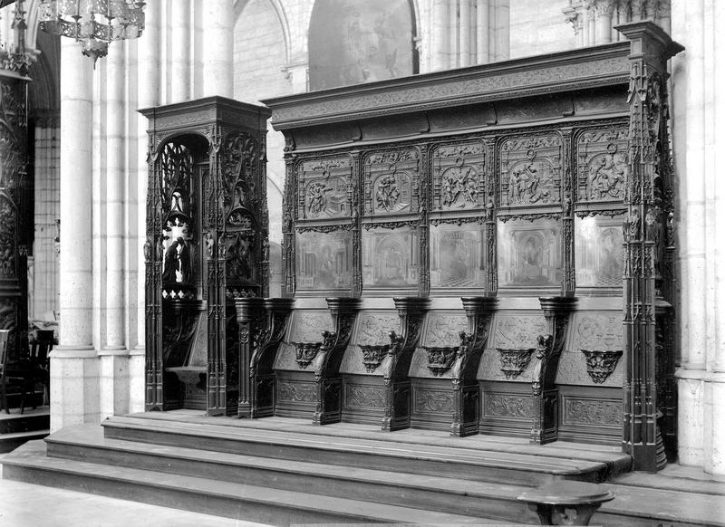 Les deux rangées de stalles à hauts dossiers ainsi que la grande chaire isolée au côté droit, viennent de la chapelle du château de Gaillon, constuite de 1504 à 1509.