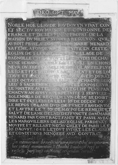 Inscription commémorative : DEO. OPT. MAX. / NOBLE HOE CLAVDE BAVDOVYN VIVAT. CON. / ET SEC. DU ROY MAISON ET COURONNE DE / FRANCE ET DE SES FINAN. PROPRI. DE LA / MAISON DV MILIEV, SVIVA. LA BESOLVON QVIL / AVROIT PRISE AVEC FEV DAMLLE. MARIE MENARD / SA FEME. A FONDE A PERPETVITE EN CESTE / EGLISE DE ST. LEV, ST. GILLES DV VILLAGE DE / BAGNOLLET, ACAVR. TOVTS LES JEVDIS CHA- / CVNE SEMAINE VN SALVT SOLEMNEL EN L4HON- / NEVR DV TR7S ST. SACREMENT DE L'AVTEL PLVS / LE TOR. ET FESTE DU ST. SACREMENT ET DE L'OC / TAVE ET ENCORES PAR CHACVN AVE. IOR. DVRAT / LET. OACTAVE PAREILS SALVTS, A CHACVN DESQLZ / LEDT. ST. SACREMENT SERA MIS ET EXPOSE SVR / LE MAISTRE AVTEL DE LADTE. EGLISE, PLVS PAR / CHACVN AN AVSSY A PERPETVITE 2 SERVICES / SOLENNELS DE REQVIEM ? LVN DESQTZ. SE DOIBT / DIRE ET SCELEBRER LE 14. 10R. DE DECEM. POR. / LE REPOS DE LAME DVDT. DEFVNCT SR. BAVDOVIN, / ET LAVTRE LE 5. 10R. DE MAY POR. LE REMEDE ET / SALVT DE LAME DE LADTE. DEFFVNCTE DAMELLE. MARIE / MENARD, PAR CONTRAT FAICT ET PASSE AVEC / LES MARGVILLIERS DE LADTE. EGLISE, PAR DEVAT. / MOYFFE ET RILLARD NORES. AV CHLET DE PARIS LE ? 3. / 10R. D'AOVST 1648, LE TOVT SVIVAT. LES CLAVSES / ET CONDITIONS MENOEES AVDT. CONTRAT. / In memoriam beneficiorum aparentibus acceptorum, : hoe piÉtatis monimentum, erigendum curauit.