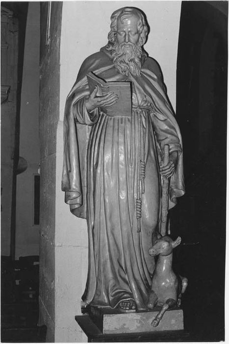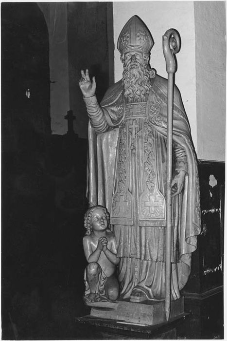 saint Leu ; saint Gilles ; en pied ; évêque ; vêtement religieux ; surplis ; chape ; étole ; mitre ; crosse ; bénédiction ; enfant ; orant ; moine ; barbe ; bâton ; bible ; biche