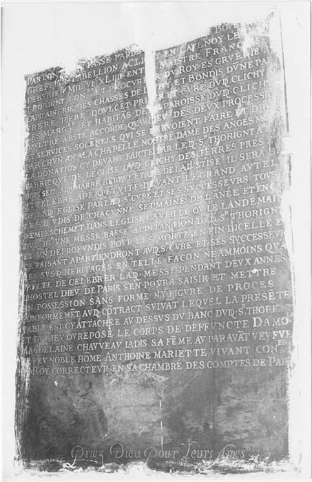 inscrition commémorative : PAR CONTRACT PASSE PAR DEVANT CHRISTOPHE BOVLEMER / GREFFIER TABELLION A CLICHY EN LAVNOY LE XXVIII / FEBVRIER MIL VIe. XL IIII. ENTRE MAISTRE FRANCOIS / THORIGNY CONER. ET PROCVREVR DV ROY ES GRVERIE ET / CAPITAINERIE DES CHASSES DE LIVRY ET BONDIS DVNE PART / FRER PIERE DOVLCET PRIEVR ET CURE DVD'. CLICHY ET / LES MARGER. ET HABITAS DE LA PAROISSE DVD'. CLICHY / DAULTRE A ESTE ACCORDE QVAV LIEV DES DEVS PROCESSIOS / ET SERVICES SOLENELS QVI SE DEBVOIENT FAIRE ET DIRE / PAR CHVN AN A LA CHAPELLE NOSTRE DAME DES ANGES MOYANT. / LA DONATION CY DEVANT FAICTE PAR LED'. SR. THORIGNY A LA FABRIQUE DE LEGLISE DUDT. CLICHY DES TERRES PRES ET / BOIS SEIZ A LA MARRE HEREBVE ET PRE LA IUSTISE IL SERA DIT / ET CELEBRE A PERPETVITE DEVANT LE GRAND AVTEL / DE LAD. EGLISE PAR LED. SR. CURE ET SES SVCCESSEVRS TOVS / LES IEVDIS DE CHACVNNE DEPMAINE DE LANEE ET EN CAS / D EMPESCHEMET DANS LEGLISE LA VEILLE OV LE LANDEMAIN / DUDT. IOR. VNE MESSE BASSE A L INTANTION DUDT. SR. THORIGNY / ET VN DEPROFVNDIS POVR LES MORTZ EN FIN DICELLE ET / CE FAISANT APARTIENDRONT AVDT. SR. CVRE ET SES SUCCESSEURS / LES SVSDT. HERITAGES EN TELLES FACON NEAMMONS QVA / FAVLTE DE CELEBRER LADT. MESSE PENDANT DEUX ANNES / L'HOSTEL DIEV DE PARIS SEN POVRA SAISIR ET METTRE / EN PESSESSION SANS FORME NY FIGVRE DE PROCES / CONFORMEMENT AVD. CONTRACT SVIVAT LEQUEL LA PRESETE / TABLE EST CY ATTACHEE AV DESSVS DV BANC DUD. SR. THORIGNY / ET DV LIEV OV REPOSE LE CORPS DE FEFFUNCTE DAMOLE. / MAGDELAINE CHAVVEAV IADIS FEME AV PARAVAT VEVEFVE / DE FEV NOBLE HOME ANTHOINE MARIETTE VIVANT CONER. / DV ROY CORRECTEVR EN SA CHAMBRE DES COMPTES DE PARIS / Priez Dieu pour Leurs Ames.