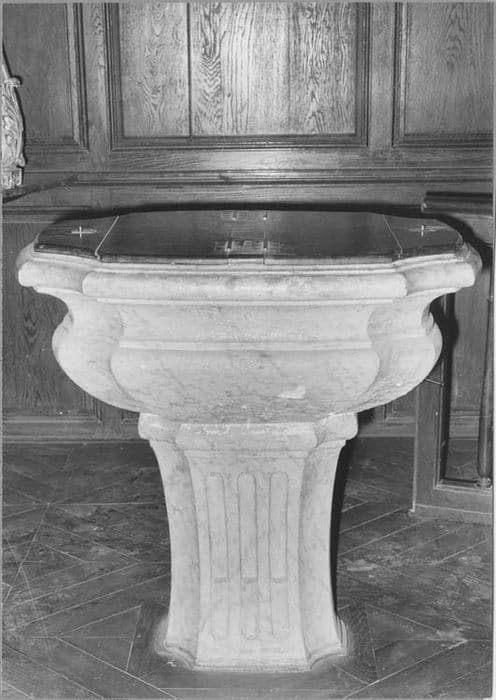 Fonts baptismaux en pierre peinte façon marbre et couvercle de bois. Le pied est de plan ovale aux angles abattus en cavet. Ses faces principales sont ornées de trois cannelures redentées. La cure, de même plan que le pied, est profilée en doucine.
