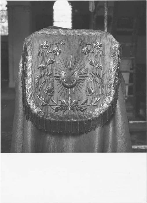 ornements sacerdotaux : chape, chasuble, étole curiale, étole de diacre, 2 dalmatiques, 2 manipules