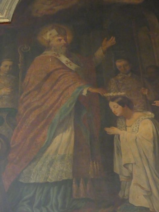 saint Médard ; évêque ; couronnement ; jeune fille ; agenouillé ; couronne ; rose ; intérieur ; église ; femme ; prêtre ; ange ; nuée