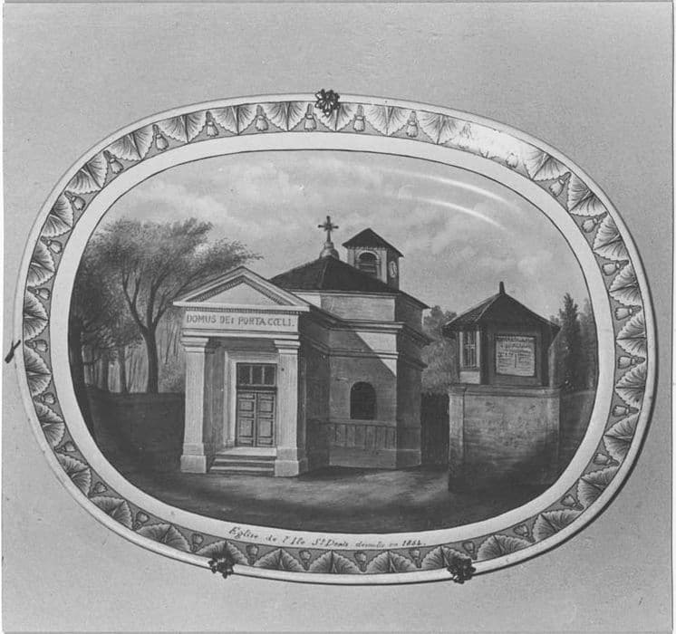 La frise du mali est géométrique sur l'un des plats avec un filet de glands sur un autre. Au centre : façade de l'église ancienne et nouvelle.