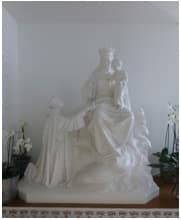 Ensemble de trois sculptures en plâtre intitulé Le Rosaire : saint Dominique aux pieds de la Vierge à l’Enfant