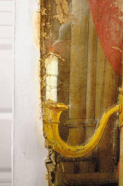Toile formée de trois lés. D'après les traces retrouvées lors de la dernière restauration, seul le lé central était peint au revers, il était donc le seul à donner des effets de lumière.
