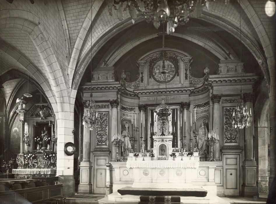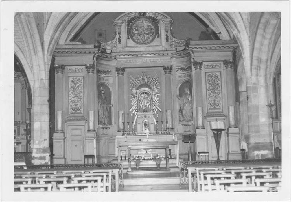 Quatre commissaires sont nommés le 23 nivose : pour faire le toisé des menuiseries et boiseries de la cy devant église ; Le grand autel en bois de chêne de hauteur et de largeur y compris les colonnes et ornements cintrés dans tout le pourtour dudit autel et de chaque côté y compris les deux portes, l'une faisant une armoire et l'autre une ouverture pour aller à la sacristie produisent soixante seize toises six pieds huit pouces huit lignes (Inventaire du 27 nivose an II).