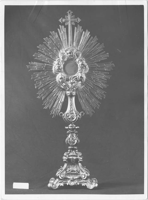 Têtes d'angelots encadrant la custode ; agneau pascal sur la base du pied.
