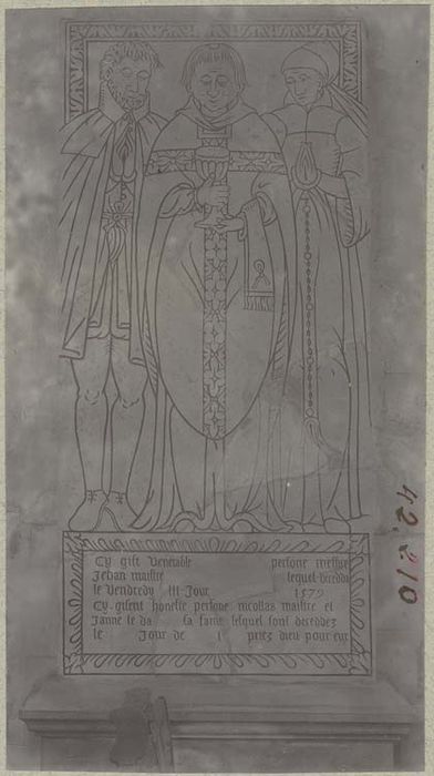 dalle funéraire (gisant) de Jehan Maistre, prêtre, de Nicolas Maistre et de sa femme