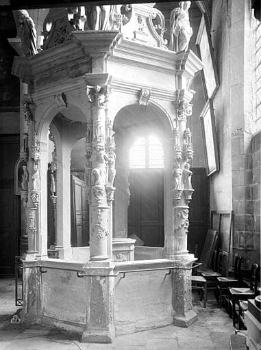 Fonts baptismaux surmontés d'un baldaquin. Composés d'une cuve hexagonale reposant sur son piédestal hexagonal. L'édicule qui recouvre les fonts baptismaux comprend un soubassement supportant six colonnes reliées entre elles par des arceaux, au-dessus desquels règne une galerie ornée de statues : la Force, la Justice, la Science, la Vertu, etc. Le dôme qui recouvre l'ensemble est couronné par une statue de Saint Jean-Baptiste, probablement moderne. Sur les fûts des colonnes, de petits encorbellements soutiennent des groupes de statuettes : les Evangélistes, Sainte Véronique, la Décollation de Saint Jean-Baptiste, etc.