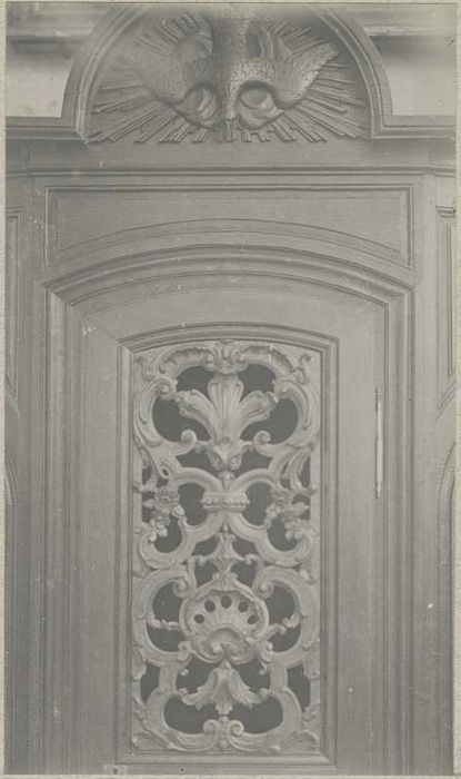 Le centre du confessionnal est surmonté d'un fronton semi-circulaire.