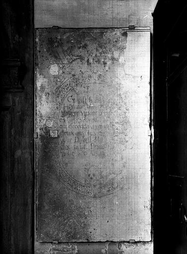 Inscription (incomplète) : Cy gist le corps ... personne Pierre Mercier en son vivant maistre masson de l'eglise de ceans et trepassa le dimanche de la Trinité XXIe jour de may mil Ve LXX et Jehanne Fourmont sa femme laquelle deceda le jour de ... mil Ve ... priés Dieu pour leur ames. Date : 1570.