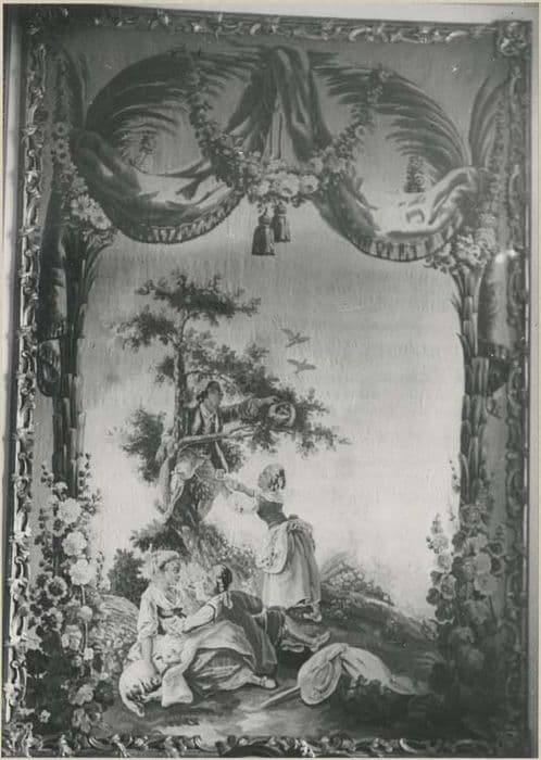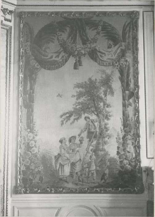 Scènes champêtres et jeux d'enfants : un dénicheur de nids, cueillette de fruits par un jeune homme monté dans une échelle dans un arbre, l'escarpolette et mat de cocagne. En haut, draperies et guirlandes de fleurs.