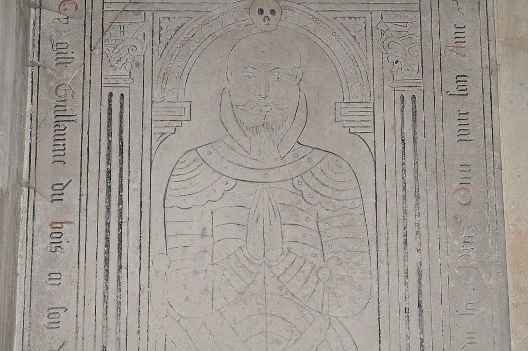 Guillaume du Boys est mort en 1570. Cette dalle est celle du mari de la dame de Viarmes, classée le 4 décembre 1914.