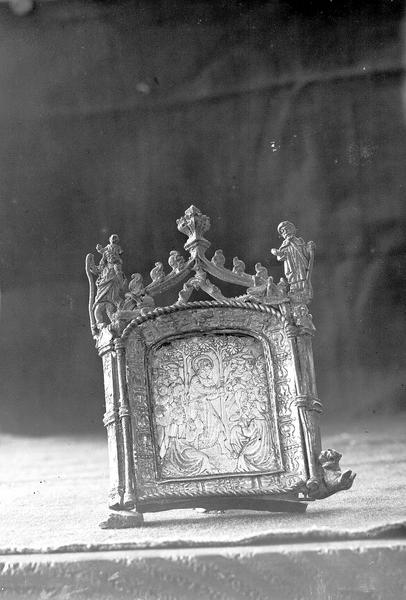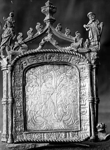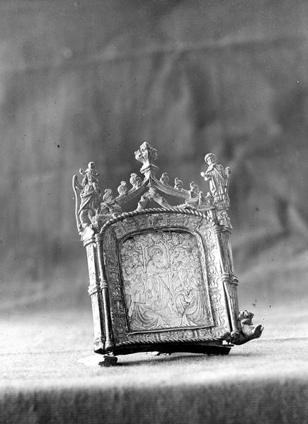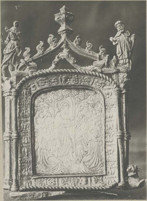 Sous un arc surbaissé, une plaque en argent gravé qui a dû recevoir un émail translucide. Deux contreforts surmontés de Saint Christophe et de Saint Jacques l'encadrent. Un arc en accolade le surmonte.