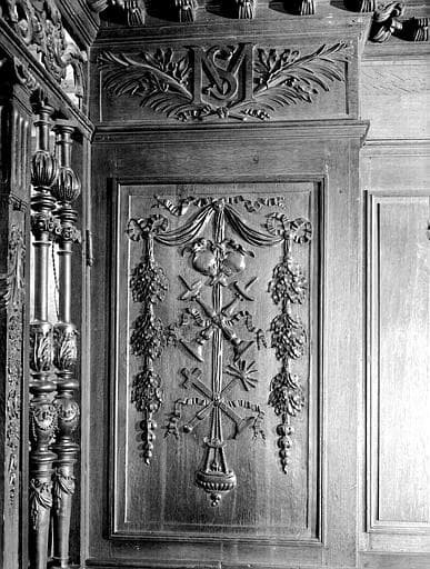 Clôture du choeur et petites tribunes autour des piliers, très richement sculptées de rinceaux, de trophées, de guirlandes, de volutes d'acanthes et de médaillons. Alternance de panneaux pleins, sculptés en bas-reliefs, d'ornements décoratifs ou de personnages et de colonnades formées par des balustres composites.