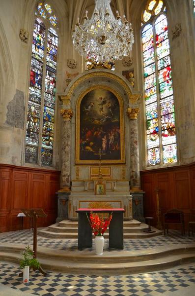 Retable monumental ne formant qu'une seule travée, en bois doré peint en faux-marbre vert pâle, est cintré en haut et flanqué de deux grandes colonnes corinthiennes.