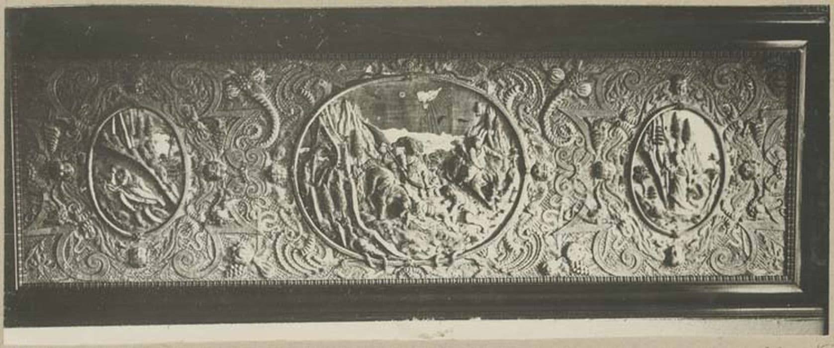 Antependium brodé en relief, comportant trois médaillons : Saint Paul sur le chemin de Damas, au centre, Sainte Madeleine, à gauche et Sainte Marthe, à droite.