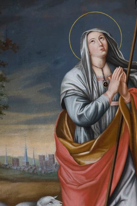Sainte Geneviève est représentée en prière, la tête auréolée. Elle porte la houlette du berger et la quenouille de laine est placée sur le rocher sur lequel elle se tient. Près d'elle plusieurs brebis et un bélier sont gardés par un chien noir qui porte un gros collier à clous. Au fond du paysage apparaît la ville de Paris qui est évoquée par ses tours, ses toits et par plusieurs flèches. Par rapport à l'oeuvre de Philippe de Champaigne dont il ne reste que l'image de sainte Geneviève, cette peinture de l'église de Beaumont-sur-Oise est plus stylisée et plus naïve.