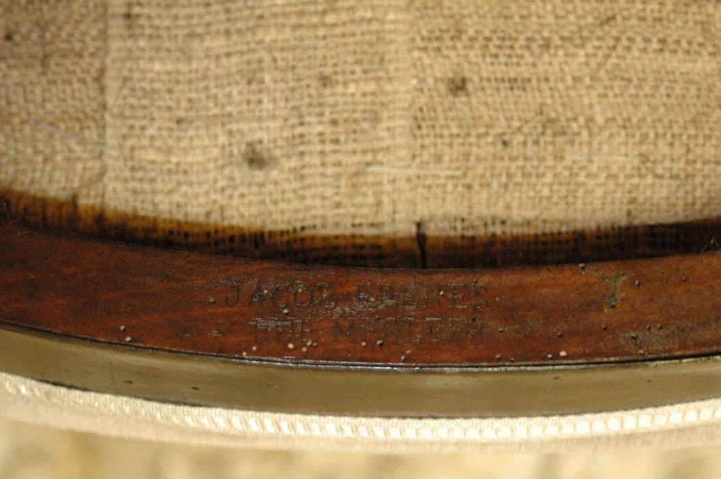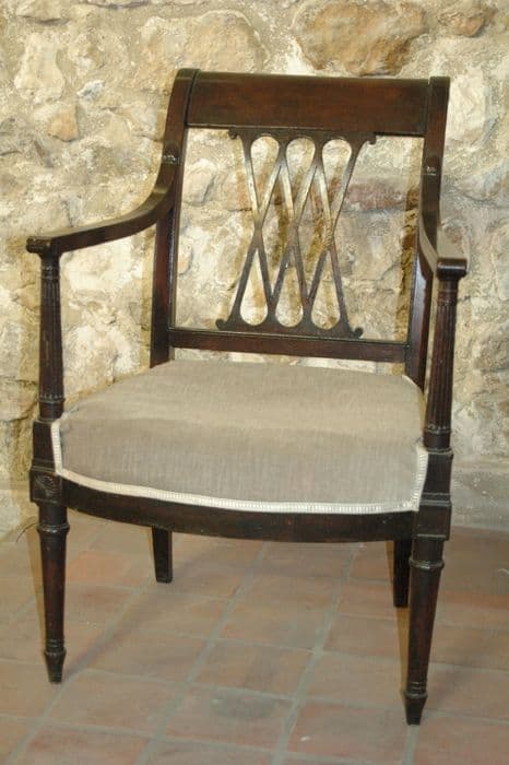 Fauteuil à dossier enroulé, en gondole. Pieds postérieurs en sabre ; pieds antérieurs tronconiques. Accotoirs à crosses ; supports d'accotoirs en forme de colonne cannelée à chapiteau bagué et reposant sur un dais.