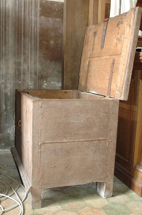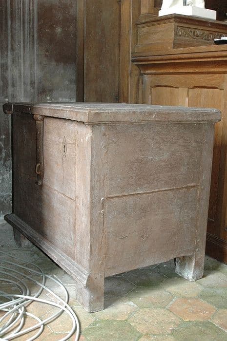 Façade et côtés : deux planches assemblées à joints vifs, à tenons et mortaises chevillés dans les montants formant pieds. Couvercle à emboîtement très épais, simplement mouluré. Moulure de base rapportée. Deux entrées de serrure de part et d'autre d'un moraillon percé s'engageant dans un passant et permettant une fermeture supplémentaire à l'aide d'un cadenas.