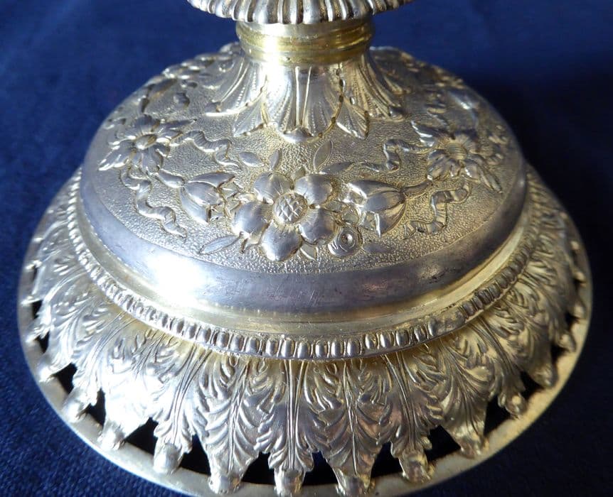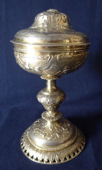 Ciboire en métal (?) doré, décor repoussé et ciselé. Le fond du décor du pied, du nœud, de la coupe et du couvercle est ciselé au mat ; la frise du pied est estampée.